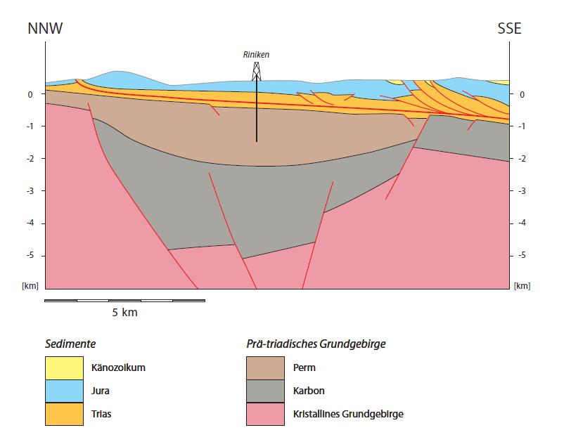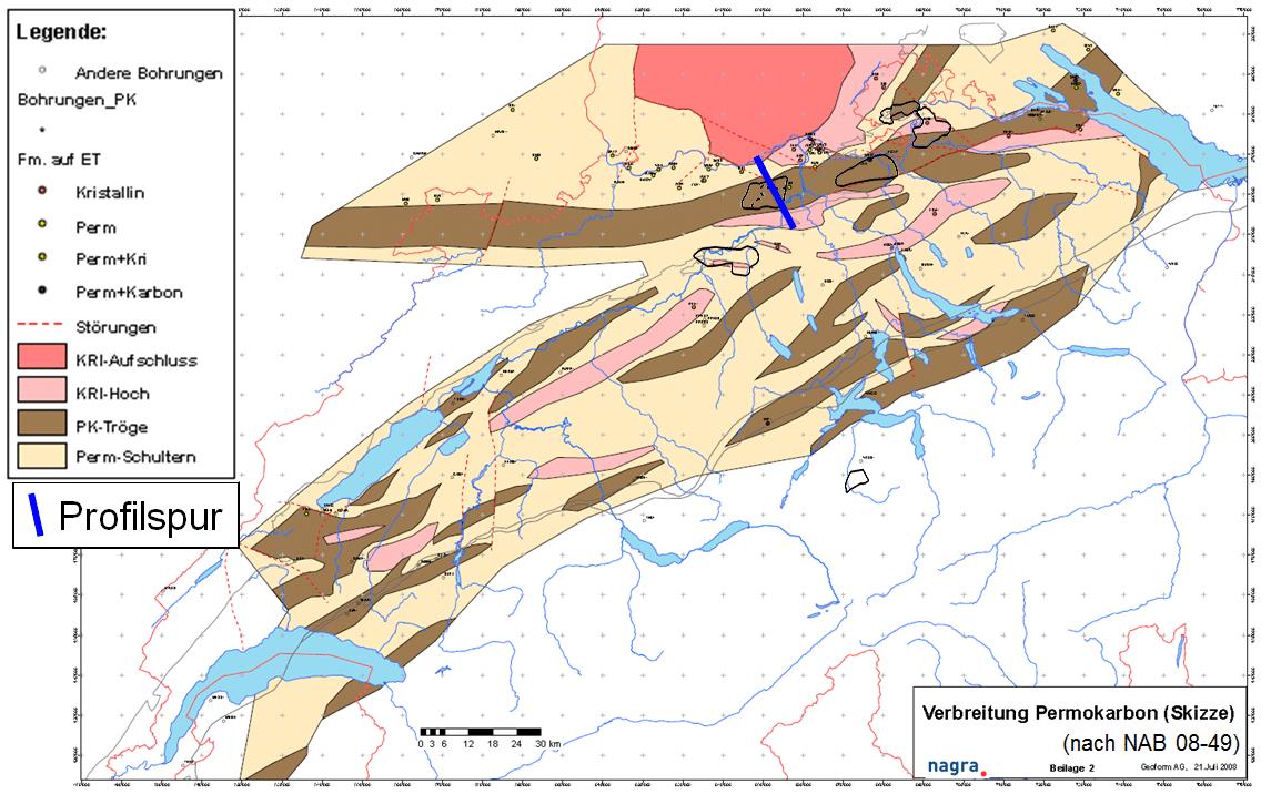 Das räumliche Ausmass der Sedimentgesteine aus dem Erdzeitalter des Perms und des Karbons im Untergrund der Nordschweiz zeigte sich erst nach und nach in den Aufzeichnungen reflexionsseismischer Profilaufnahmen als Konturen gewaltiger, trogförmiger Vertiefungen, welche sich im Lauf der Erdgeschichte, nämlich am Ende des Paläozoikums (= Erdaltertum) entlang tektonischer Verwerfungen bis mehrere Kilometer tief in den kristallinen Sockel eingesenkt hatten (Abb. 1). Diese Erkenntnisse über die Ausdehnung des seither so genannten «Permokarbontrogs» waren neu. Die Nagra hatte es als verzichtbar erachtet, tiefreichende seismische Messungen vorgängig der millionenschweren Bohrungen durchzuführen.